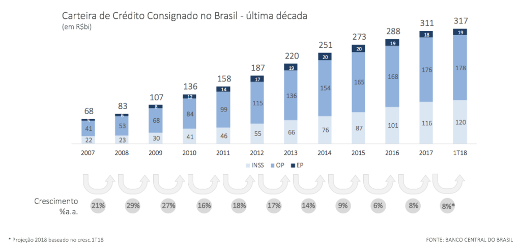 3.) O nível de endividamento dos aposentados e pensionistas do INSS e dos servidores federais, estaduais e municipais já está bastante alto. No INSS, ainda temos a entrada de novos beneficiários em um ritmo acelerado, o que ajudará nessa próxima década a manter o crescimento da carteira acima da inflação;