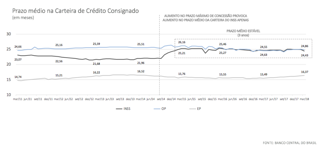 5.) Os aumentos nos prazos máximos de contratação, tanto para os beneficiários do INSS quanto para os servidores federais, estaduais e municipais já ocorreram no final de 2014 e início de 2015 para os principais convênios. Logo, a probabilidade de novas alterações do teto do prazo máximo é muito reduzida. O ganhos recorrente do aumento do teto máximo, no INSS, já foi capturado e, nos Órgãos Públicos ainda tem espaço (teto dos principais convênios é de até 96 meses) – ver gráfico 3. No INSS, o prazo médio da carteira foi pouco impactado com os aumentos do prazo (aumento do prazo de 23 para 25 parcelas pagas) e não surtiu nenhum efeito nos convênios de órgãos públicos (federal, estadual e municipal), mantendo-se constante em 25 parcelas pagas (vide gráfico 4).